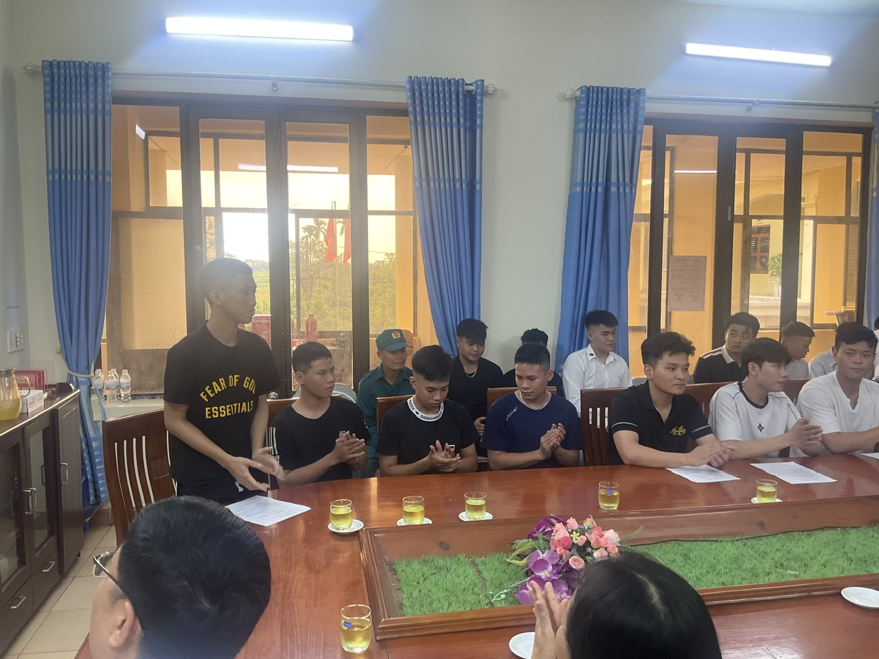Các thanh niên phát biểu ý kiến bản thân tình nguyện Lãnh đạo xã tặng quà các tân binh tình nguyện lên đường nhập ngũ