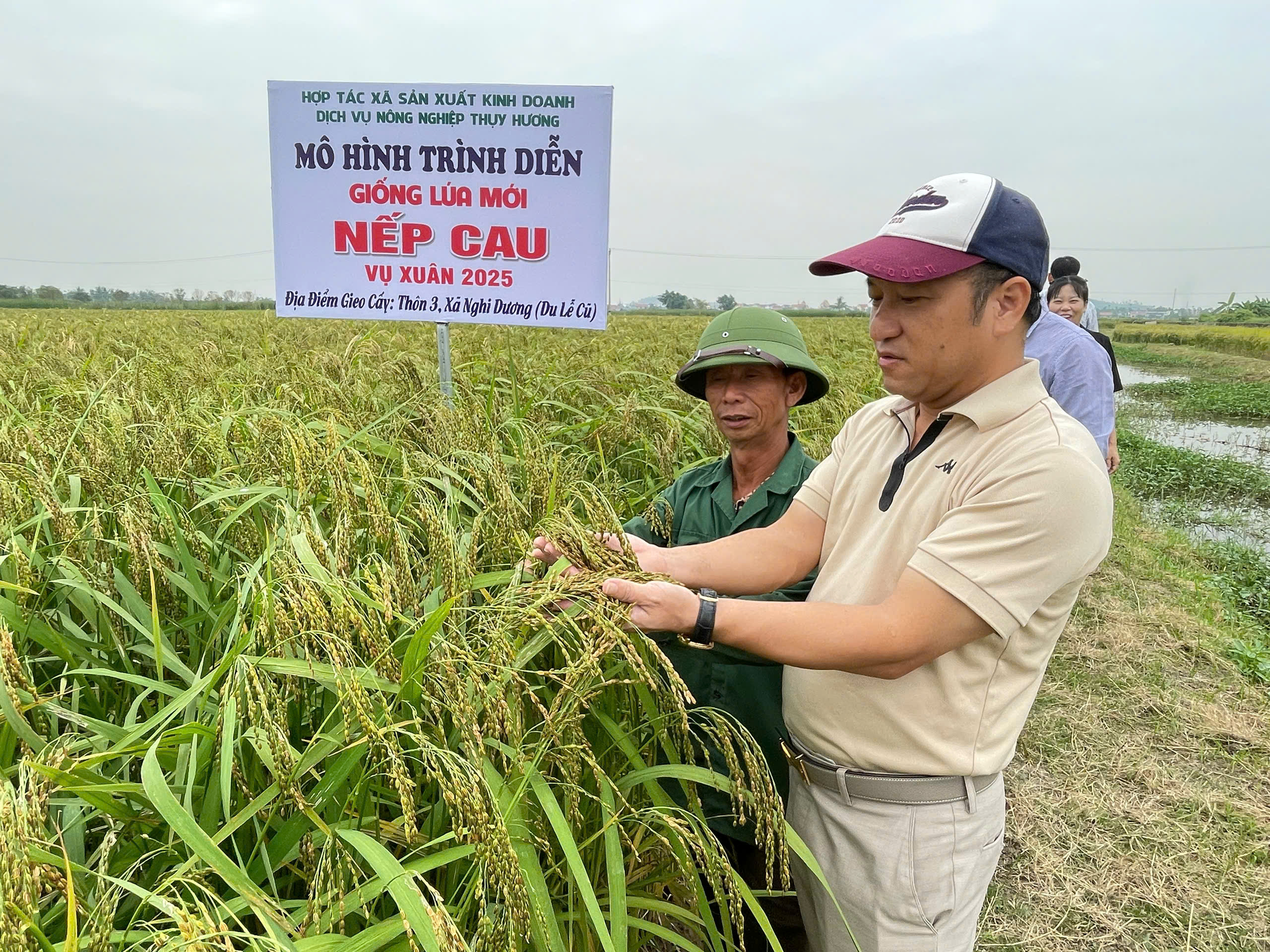 Đồng chí Ngô Duy Khâm – Chủ tịch UBND xã Nghi Dương thăm mô hình trình diễn giống lúa mới Nếp Cau vụ Xuân 2025